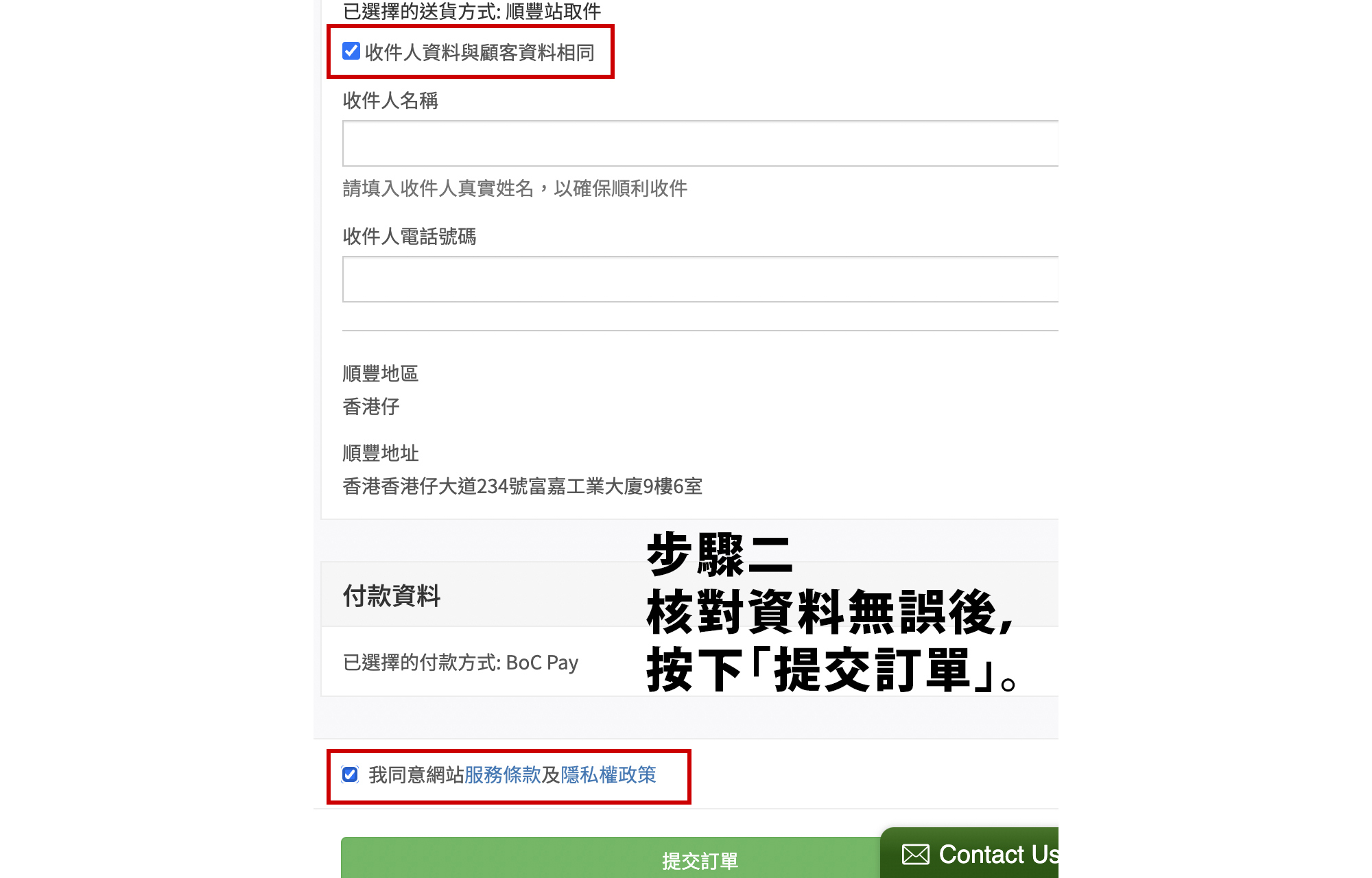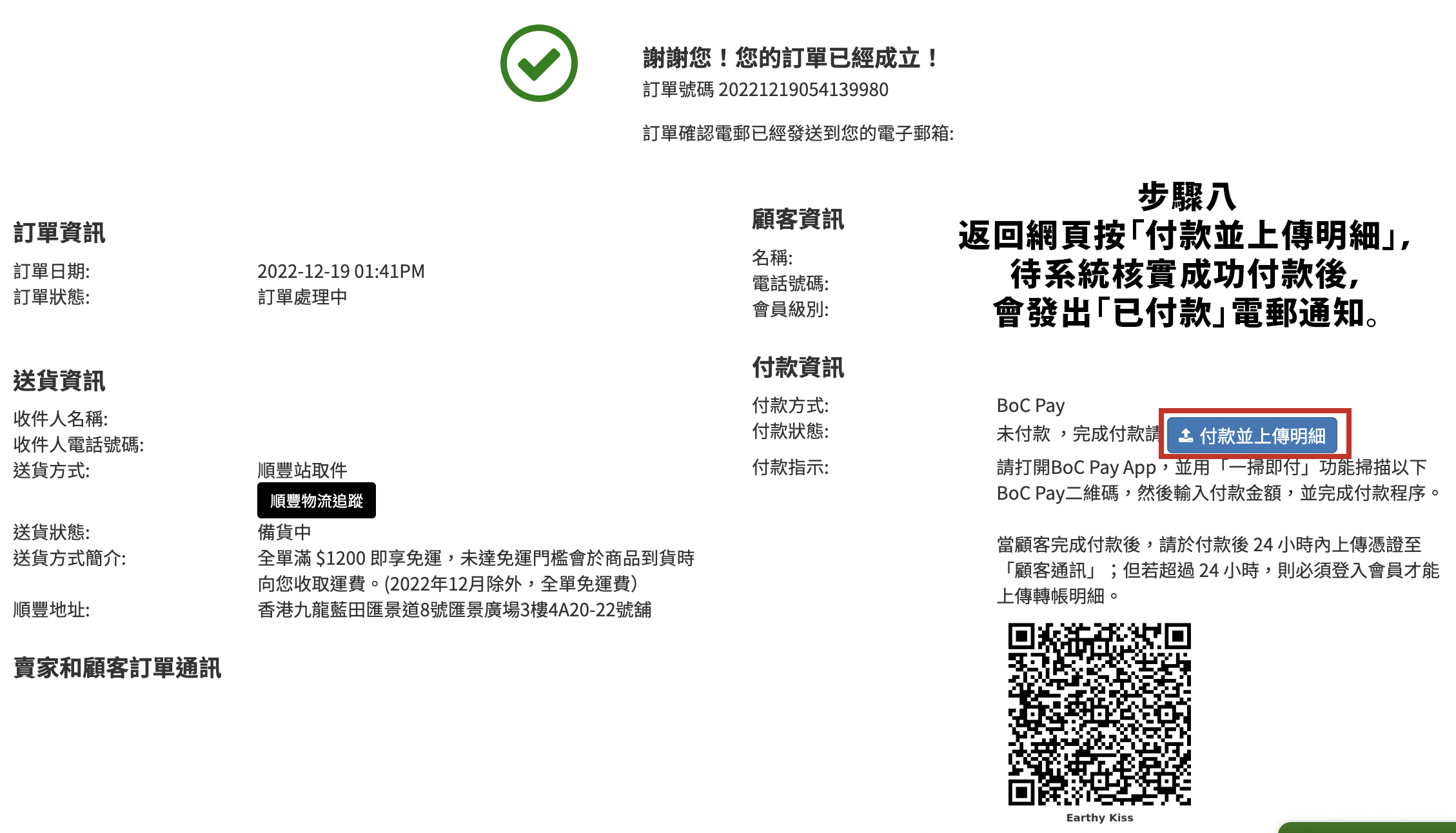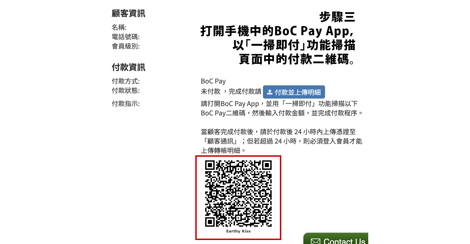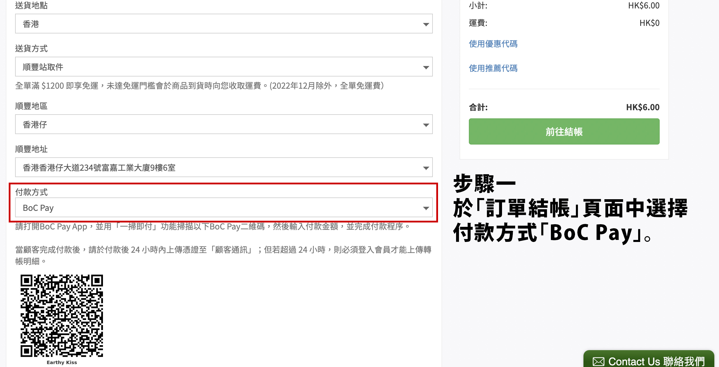 於「訂單結帳」頁面中選擇付款方式「BoC Pay」。