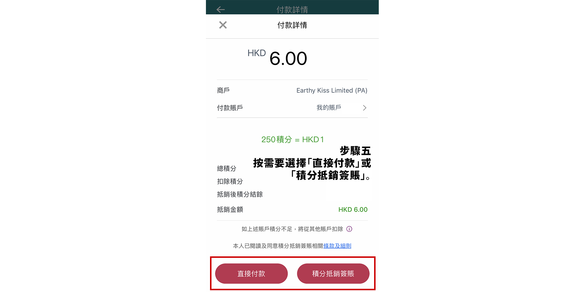 按需要選擇「直接付款」或「積分抵銷簽賬」。