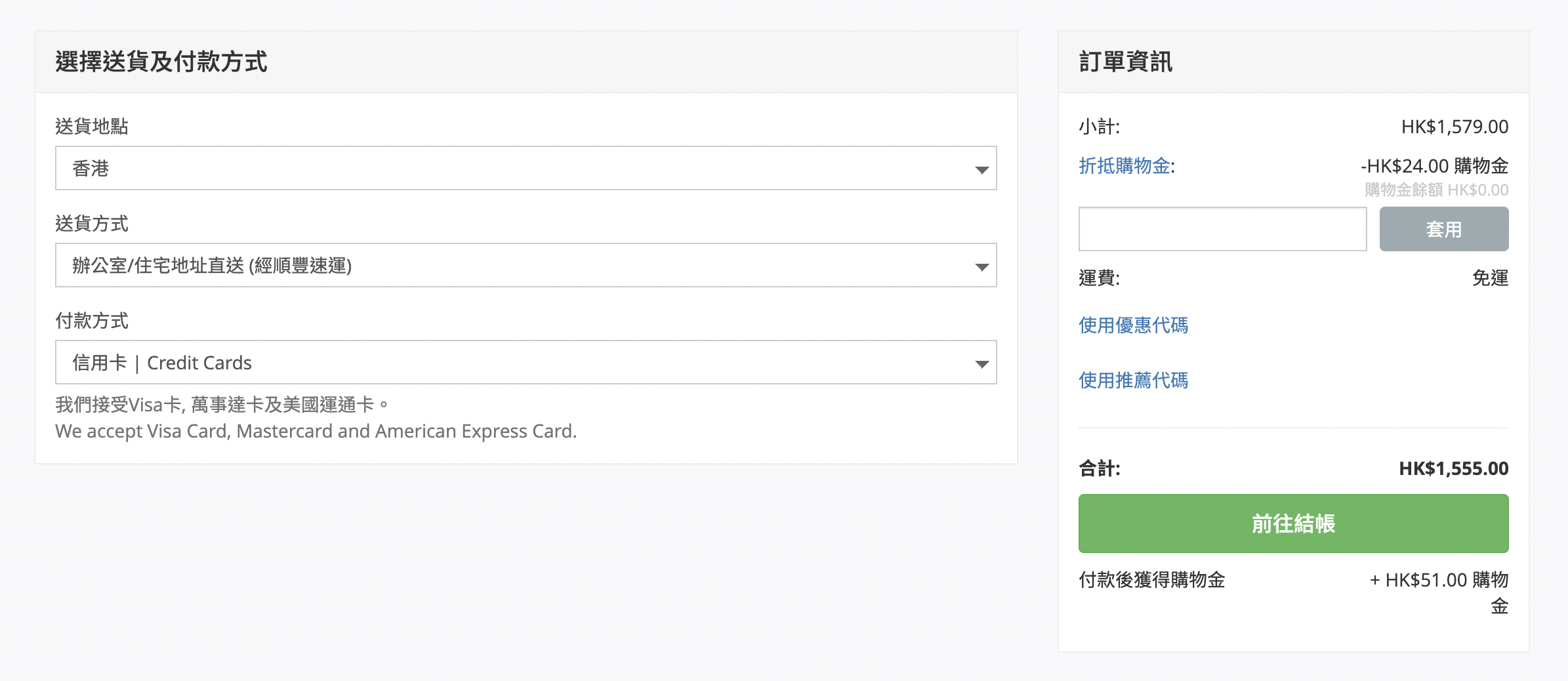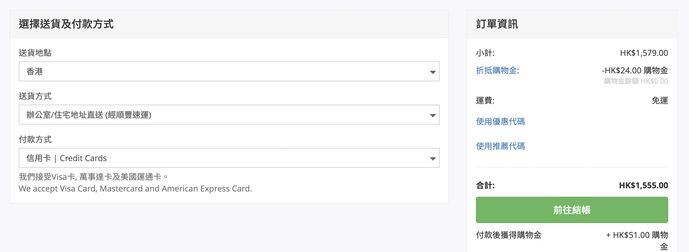 1. 在購物車結帳時,您會到達以下頁面,訂單資訊下會顯示出您可被折抵的購物金。