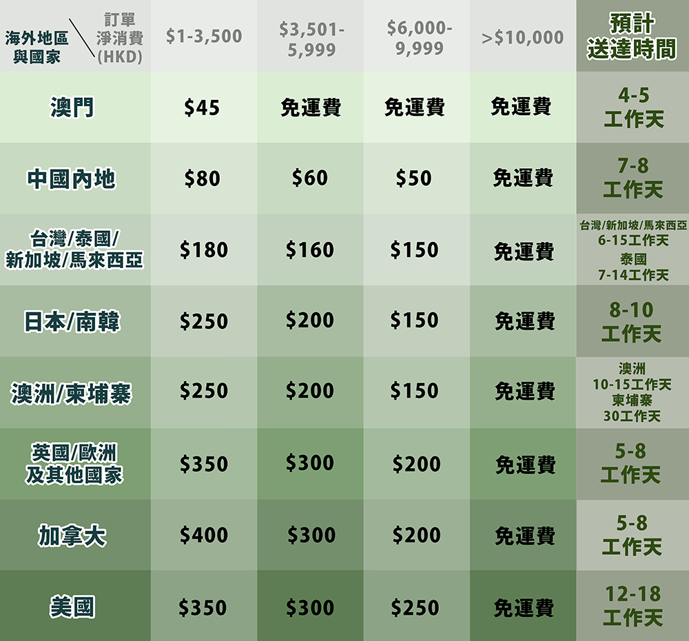 各地區/國家的確實送貨時間或受物流等不確定因素影響,以下圖表的預計送達時間僅供參考,確實送貨時間需視乎實際情況而定。
