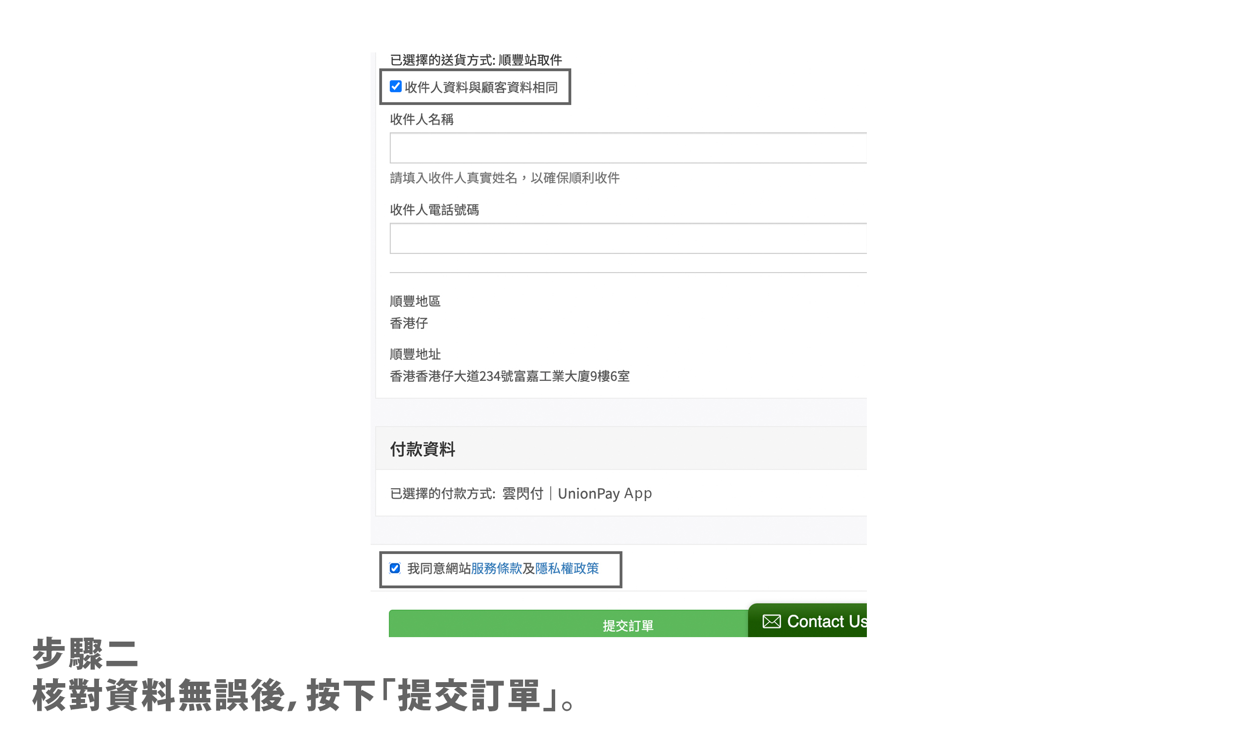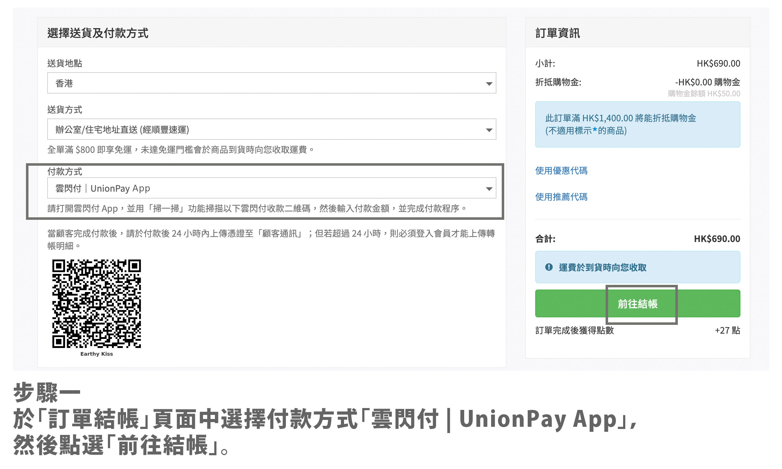 於「訂單結帳」頁面中選擇付款方式「雲閃付 | UnionPay App」, 然後點選「前往結帳」。