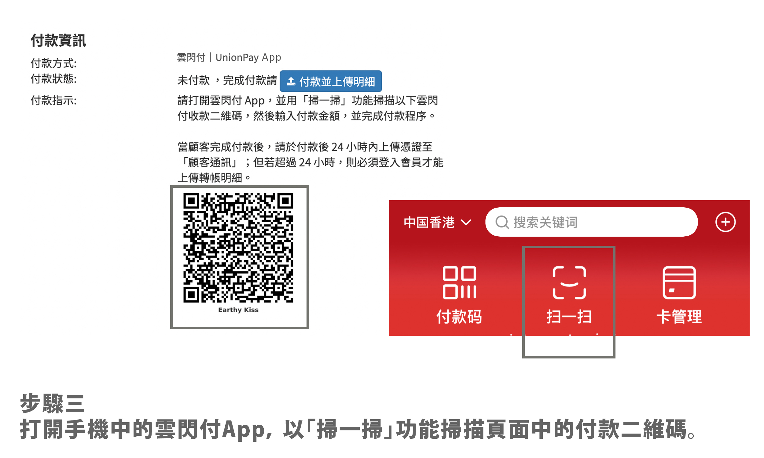 打開手機中的雲閃付App, 以「掃一掃」功能掃描頁面中的付款二維碼。