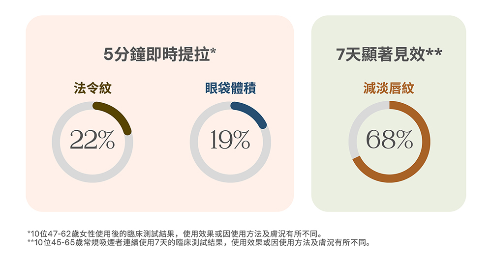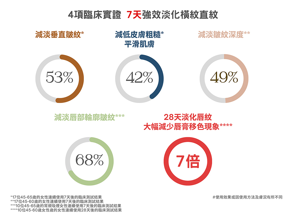 只需7天,皺紋減少高達68%;連續使用28天,減少唇膏因唇紋移色暈妝高達7倍。