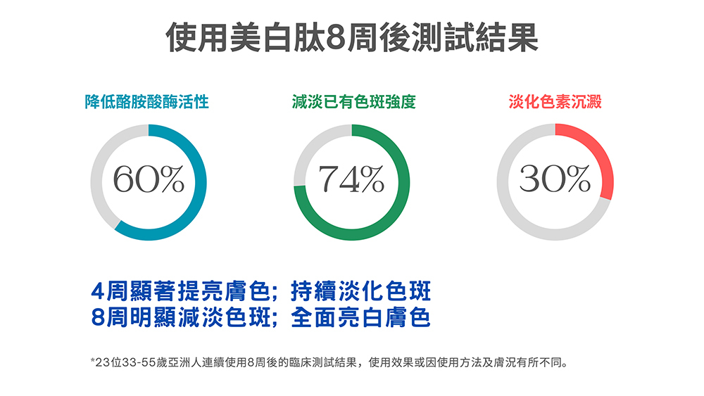 臨床測試實證美白肽,有效弱化黑色素母細胞 Tyrosinase(酪氨酸酶)的活性,從而減少黑色素過量生成,減少黑色素積聚,大大降低黑色素成功合成的機會,同時改善色斑沉著問題。